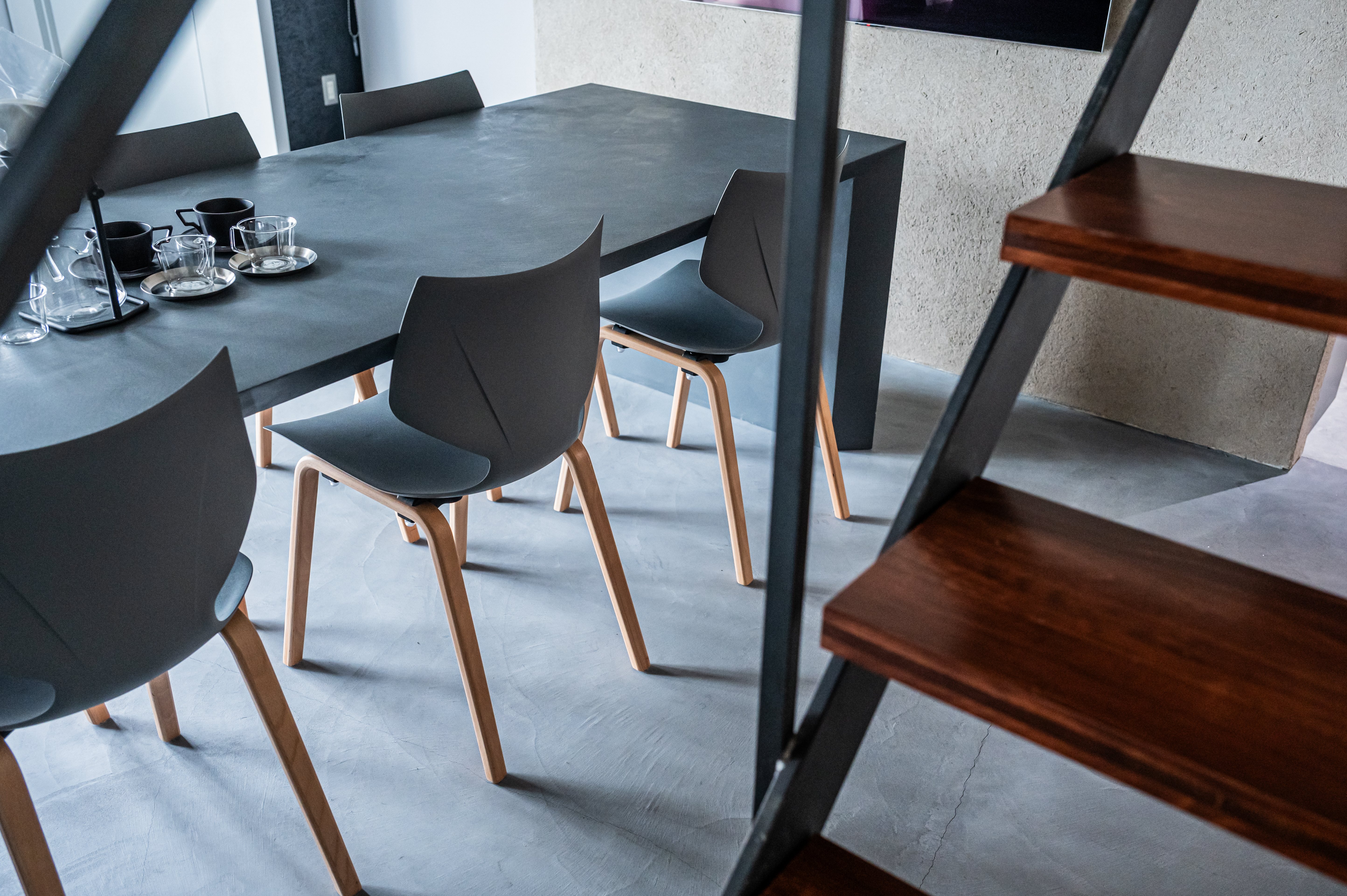 実際にお客様に提案する際にどんな素材を使っているの? リノリウムを活用したテーブルなど、オフィスにはこだわりの素材が盛りだくさん。実際に見て、触れてみてください。